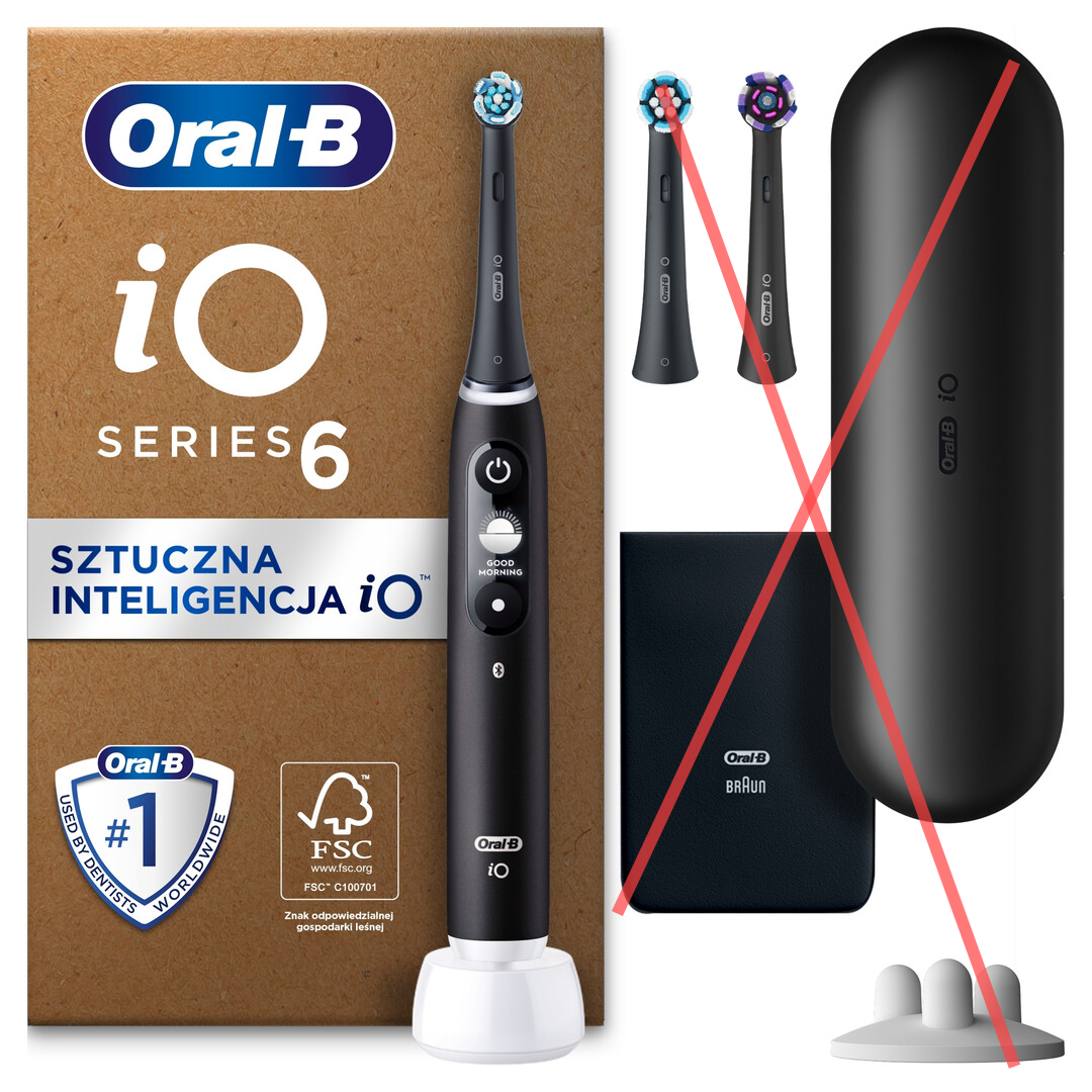 ![]() | Oral-B iO 6 Czarna szczoteczka elektryczna w zestawie akcesoria, 3 końcówki, 1 etui podróżne, 1 ładowarka, 1 pokrowiec, stworzona w technologii Braun z napędem magnetycznym, interaktywny wyświetlacz Czarna + 3 końcówki + etui | 385 zł | B0B59Z1X62 | 4210201443766 |